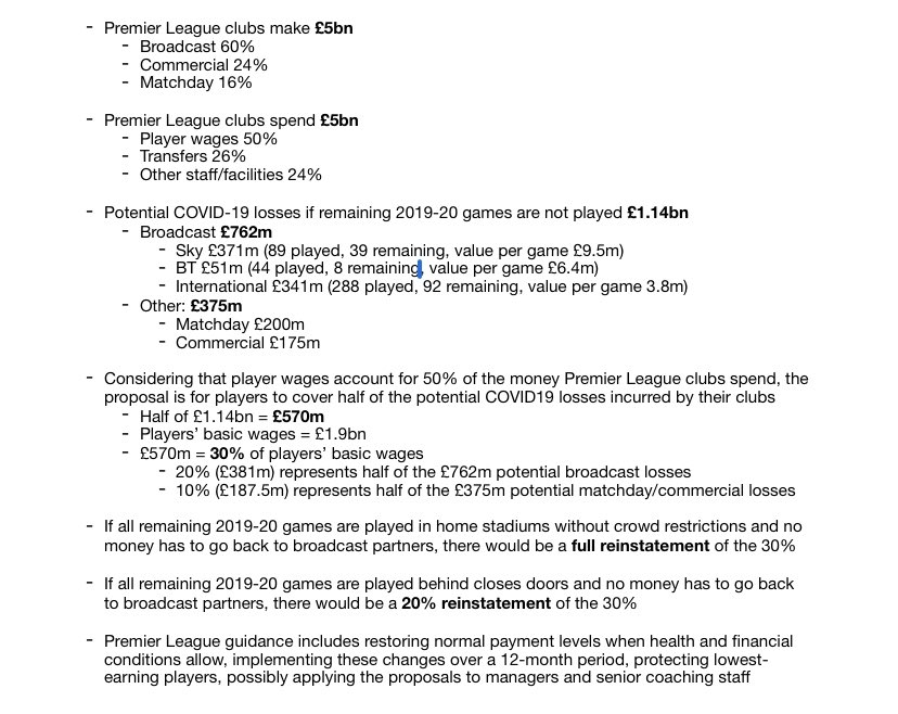 Tried to explain below how PL projected collective #COVIDー19 losses across clubs at £1.14bn & proposed a 30% wage cut/deferral for players. One size doesn’t fit all so individual talks more likely. For club-by-club details read @mjshrimper @TheAthleticUK: https://t.co/5cVjErC2Or pic.twitter.com/v1bPPWwXdP