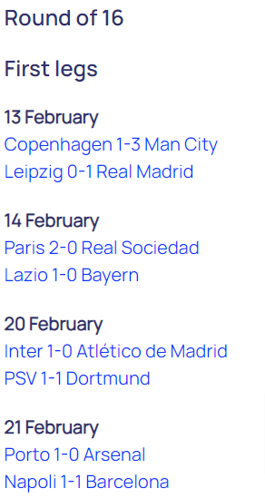 23/24 UEFA CL ラスト16ファーストレグの結果