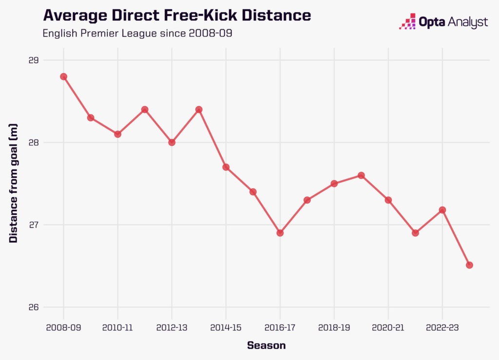 - しかしショッツが減っていながらも、フリーキックのゴールまでの平均距離は08-09以降2.5mほど短くなっている