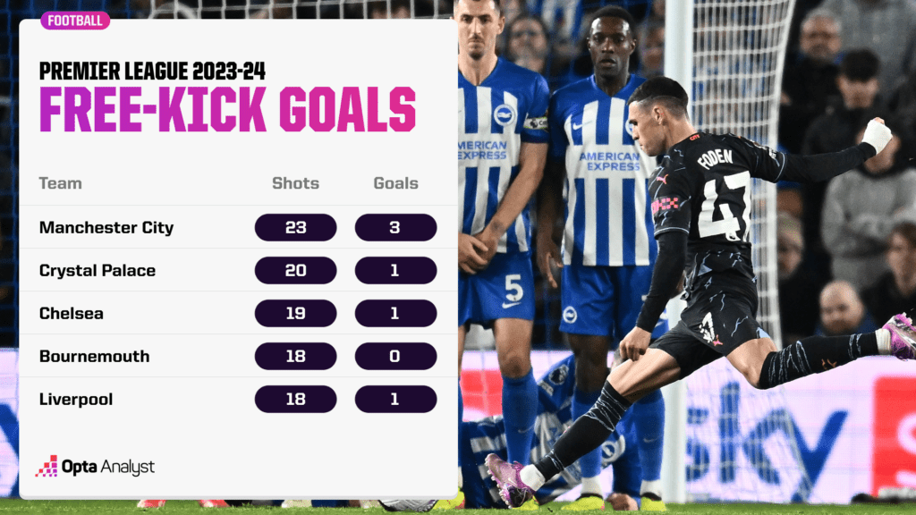 PLでは近年フリーキックからの直接シュート、ゴールが減っている