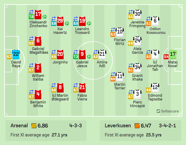 サブは、キヴィオール(46 サリバ)、MLS(46 ジンチェンコ)、ライス(46 ジェズース)、サカ(46 ヴィエラ)、パーティ(63 ジョルジーニョ)、ワニエリ(63 オーデガード)、ニコルズ(71 ホワイト)、ヘヴン(71 ガブリエル)、エンケティア(71 ハヴァーツ)、マルティネリ(82 トロサール)