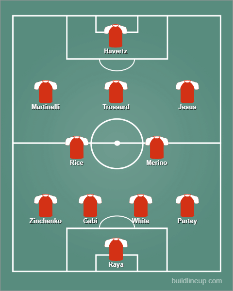 ハヴァーツとトロサールがフロント2の4-4-2。ひとまずサカとティンバー、カラフィオーリが不在の前提での予想。