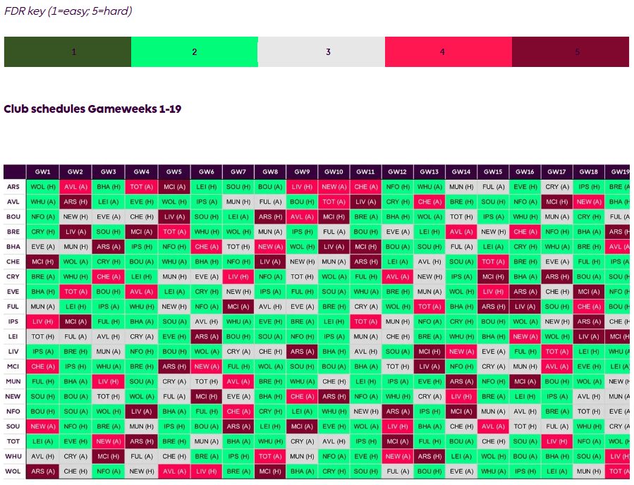 下の表は、PL公式サイトからの情報である(Fantasy PLのFDR=Fixture Difficulty Ratings)。シーズン前半GW19までの対戦相手の強さを5段階で評価したもの。※強さはアルゴリズムで決定