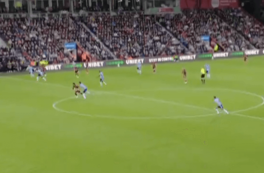 ボーンマスの9のEvanilsonはその瞬間はオフサイドポジションだったものの、味方のパスじゃないのでそもそもオフサイド判定はなく。意表を突かれたサリバも彼を止めるには手を使ってつかまえるしかなかった。多くのメディアは、これを「パニック」と評した。