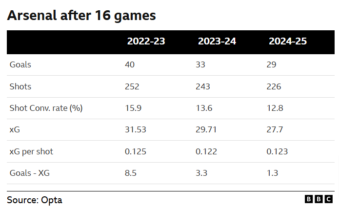 それと、アーセナルは年々攻撃力が落ちているというスタッツもある。以下、この3シーズンの16試合までの数字。